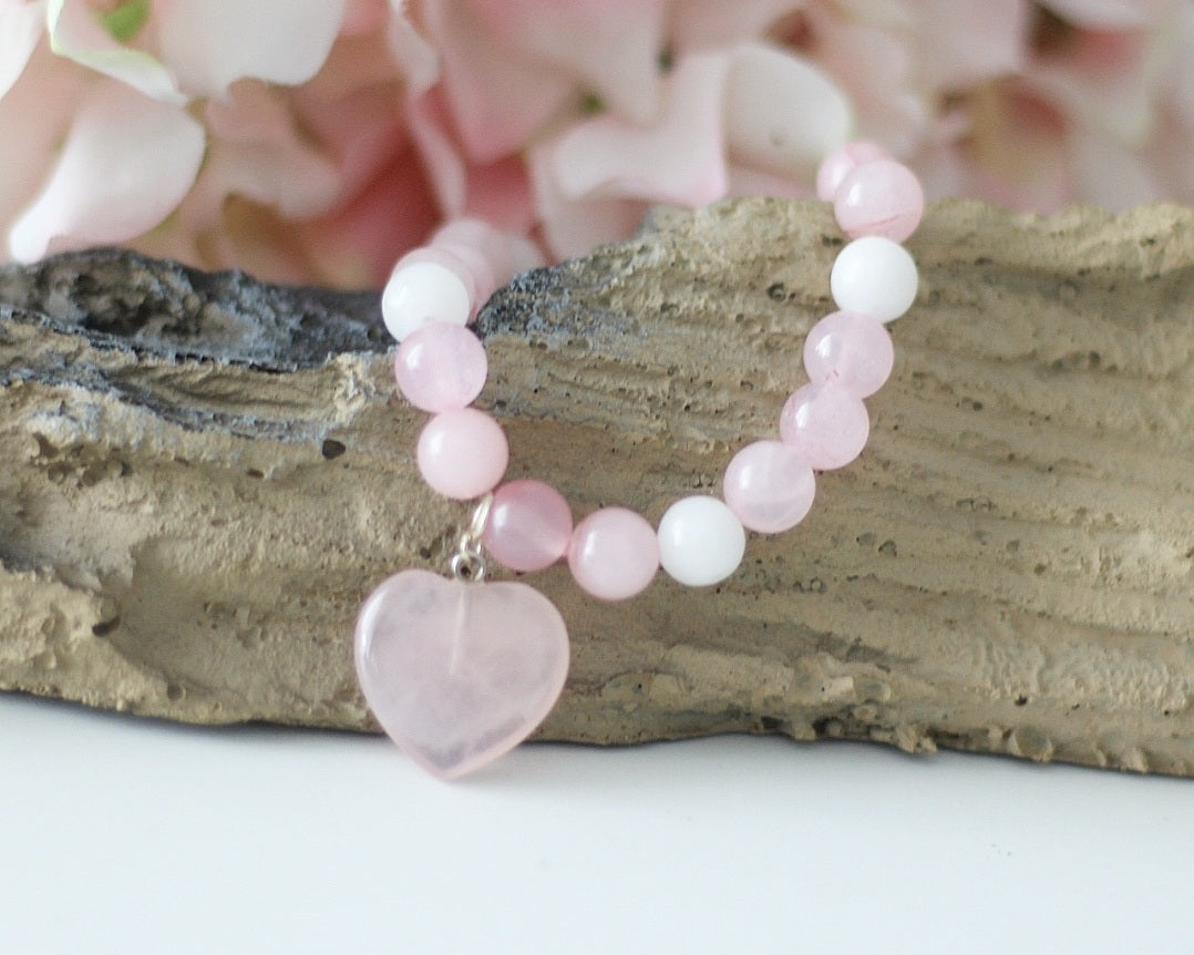 Dieses zarte Armband vereint zwei kraftvolle Edelsteine – sanften Rosenquarz und klare weiße Jade. Der sanft rosafarbene Herzanhänger aus Rosenquarz ist das Highlight des Designs und unterstreicht die liebevolle Symbolik dieses Schmuckstücks.