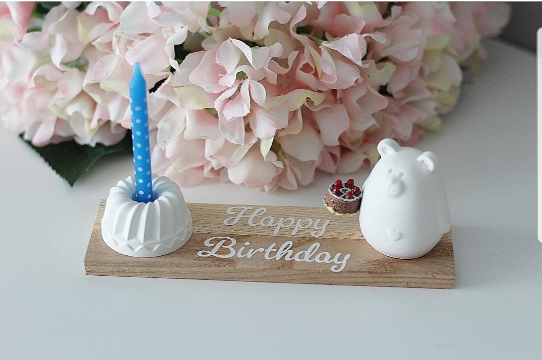 Diese charmante Deko-Szene ist das perfekte Highlight für jede Geburtstagsüberraschung. Auf einem liebevoll gestalteten Holzschild mit der Aufschrift „Happy Birthday“ stehen ein minimalistischer Bär aus Raysin mit kleinem Törtchen und ein Kerzenhalter in Gugelhupfform bereit, um den besonderen Tag stilvoll zu begleiten.