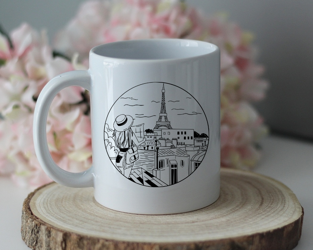 Diese stilvolle Tasse zeigt eine Frau mit Stadtplan und Rucksack, die von einem Pariser Dach aus den Blick auf den Eiffelturm genießt. Das filigrane Schwarz-Weiß-Design fängt die romantische Atmosphäre der Stadt der Liebe perfekt ein und lädt zum Tagträumen ein – ideal für Paris-Fans und Reisende mit Stil.