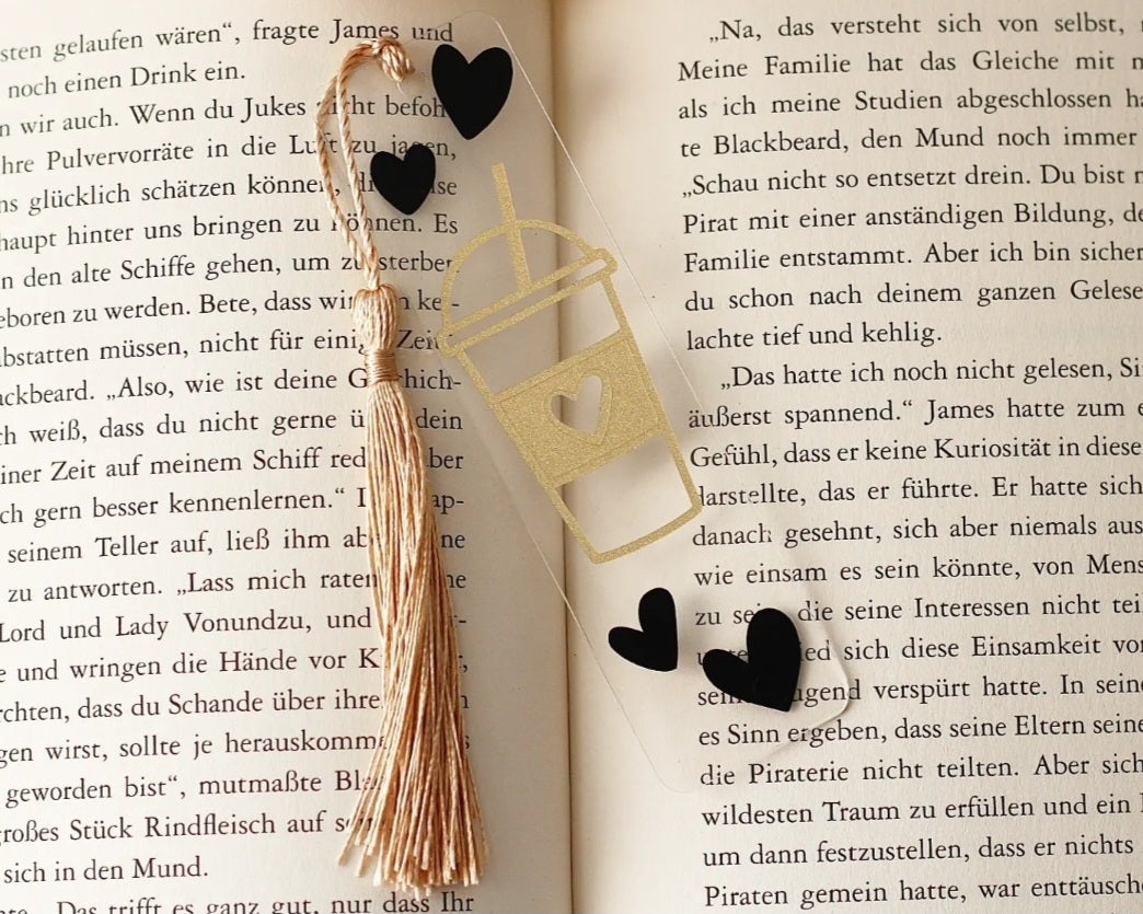 Mit diesem liebevoll gestalteten Lesezeichen wird deine Lektüre zur kleinen Auszeit. Das transparente Design zeigt einen goldenen Coffee-to-go-Becher mit Herz und vier schwarzen Herzmotiven, ergänzt durch eine elegante Quaste in Nude-Rosé.