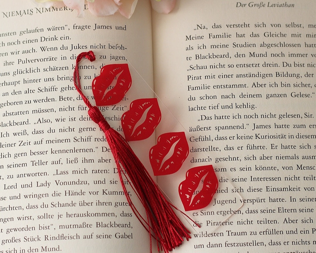 Mit diesem auffälligen Lesezeichen wird jede Lesepause zum Statement. Auf dem transparenten Lesezeichen sind vier rote Kussmund-Motive platziert, die pure Leidenschaft und Stil verkörpern. Abgerundet wird das Design durch eine leuchtend rote Quaste – ein echter Hingucker zwischen den Seiten.