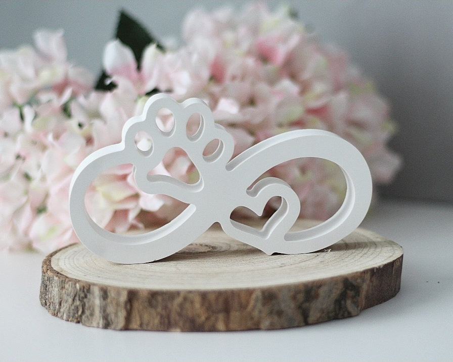 Diese liebevoll gestaltete Dekofigur symbolisiert die unendliche Liebe zu unseren Vierbeinern. Die Kombination aus dem Unendlichkeitszeichen, einer Pfote und einem Herz macht dieses Stück zu einer besonderen Hommage an treue tierische Begleiter – ideal als Erinnerung, Geschenk oder Ausdruck deiner Tierliebe.