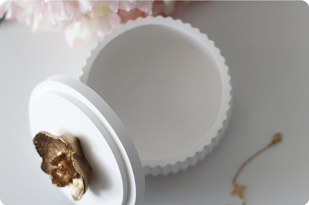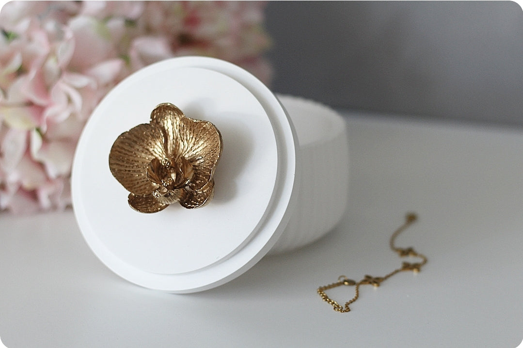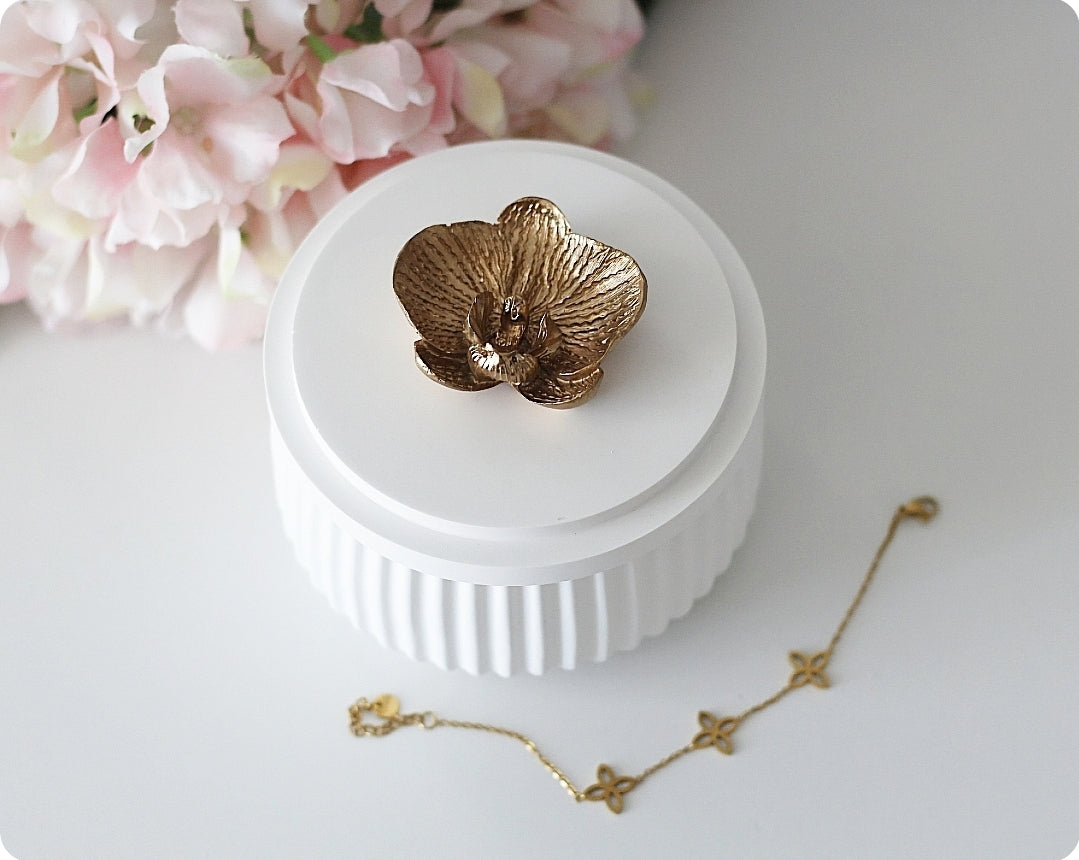 Verleihe deiner Schmucksammlung einen Hauch von Luxus mit dieser stilvollen Schmuckdose. Das matte Weiß des runden, geriffelten Behälters harmoniert perfekt mit dem edlen Deckel, der mit einer detailreich gearbeiteten, Orchideenblüte verziert ist – ein echter Blickfang auf jedem Schminktisch oder Regal.
