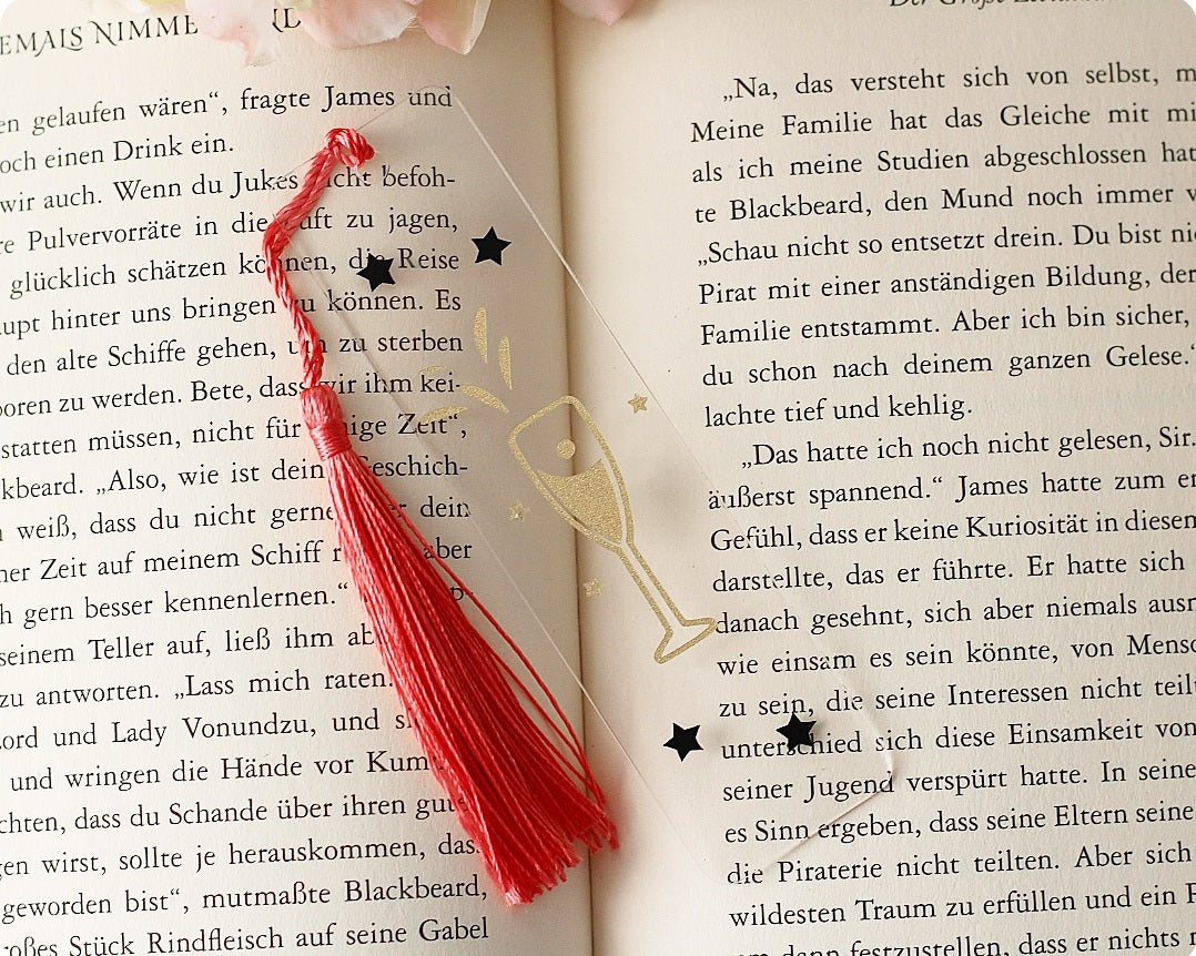 Dieses elegante Lesezeichen aus transparentem Acryl verleiht jedem Buchmoment eine festliche Note. Verziert mit einem goldenen Champagnerglas und kleinen Sternen ist es das perfekte Accessoire für alle, die ihre Lesepausen stilvoll gestalten möchten. Die Troddel sorgt für einen farblichen Akzent und erleichtert das Wiederfinden deiner Seite.