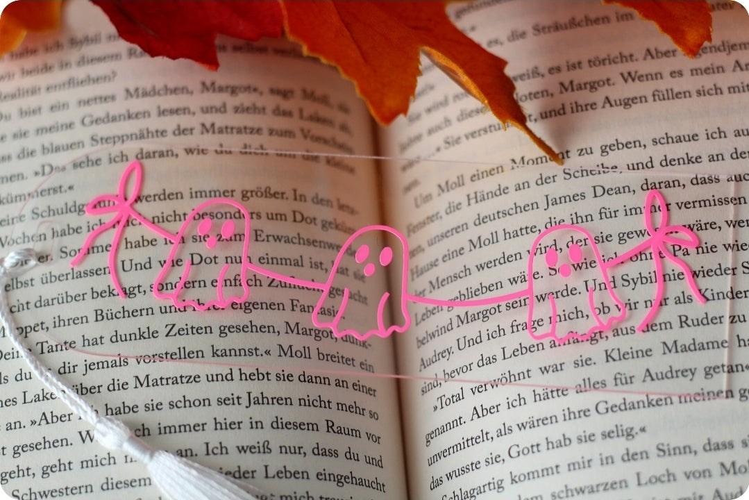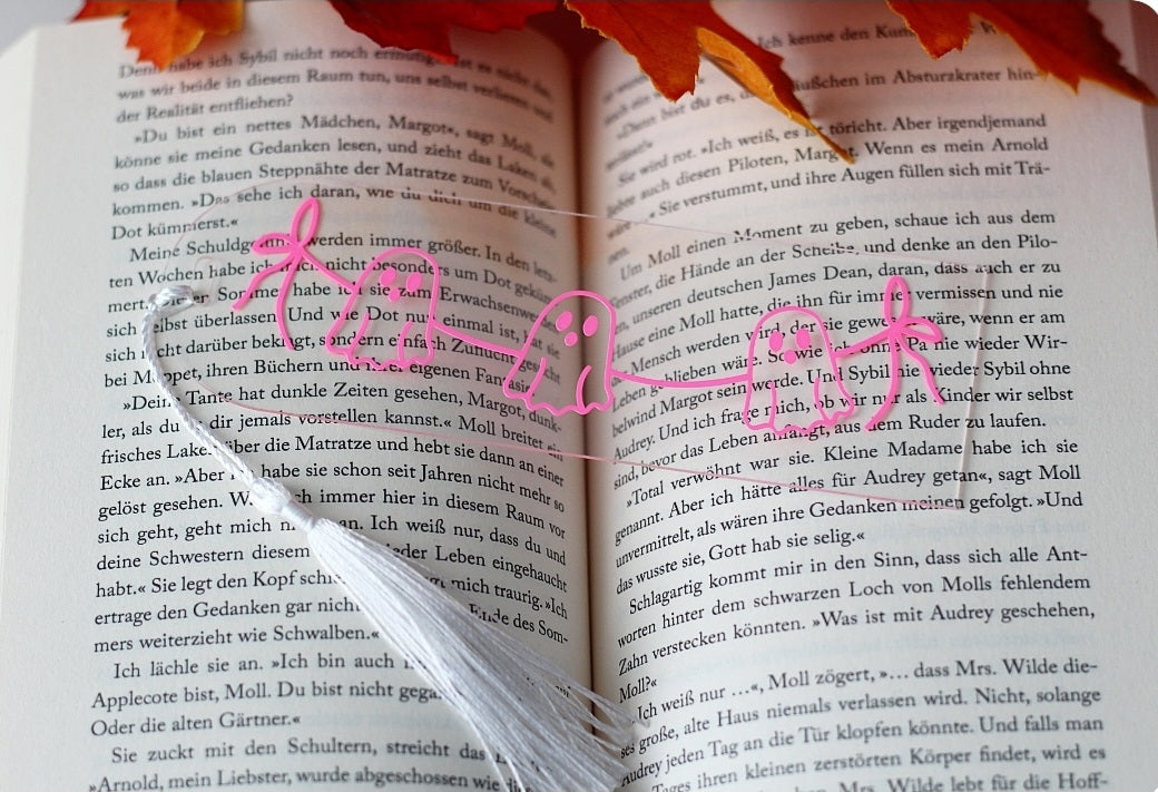 Dieses liebevoll gestaltete Lesezeichen ist der perfekte Begleiter für alle Bücherfreunde – besonders in der Herbst- und Halloweenzeit! Das klare, transparente Material verleiht dem Lesezeichen eine elegante Leichtigkeit, während die darauf geplotteten verspielten pinken Geister für einen charmanten, saisonalen Akzent sorgen.