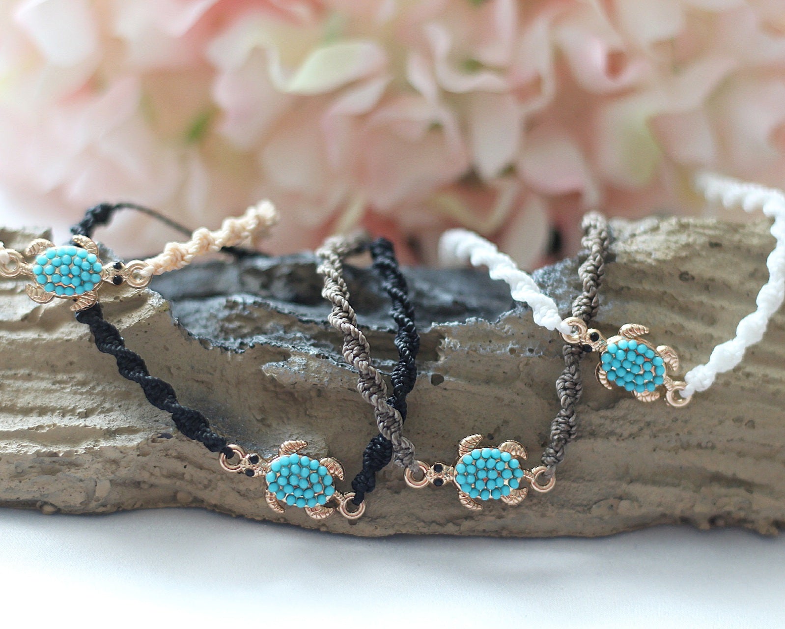 Dieses liebevoll handgefertigte Makramee-Armband vereint maritimen Charme mit symbolischer Bedeutung. Der goldfarbene Schildkrötenanhänger mit türkisfarbenen Details steht für Schutz, Langlebigkeit und innere Ruhe. Das Armband ist in verschiedenen Farben erhältlich und durch den verstellbaren Verschluss individuell anpassbar – perfekt für jedes Handgelenk.