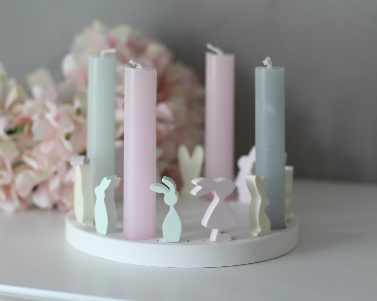 Dieser handgefertigte Kerzenring ist ein zauberhafter Blickfang für die Frühlings- und Osterzeit. Gefertigt aus hochwertigem Raysin und liebevoll dekoriert mit kleinen Hasenfiguren in zarten Pastelltönen, bringt dieser Kranz eine verspielte, aber stilvolle Note in dein Zuhause.