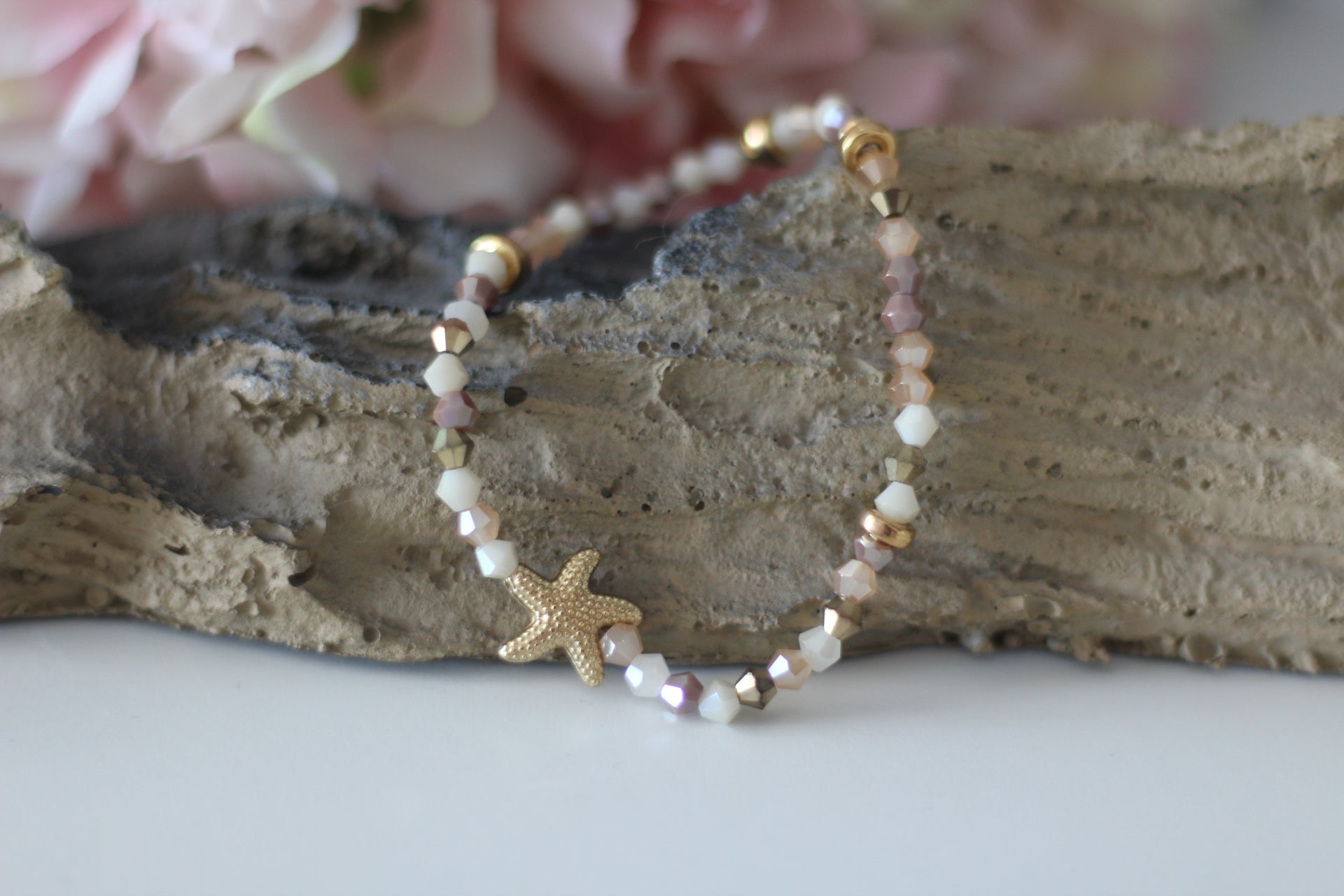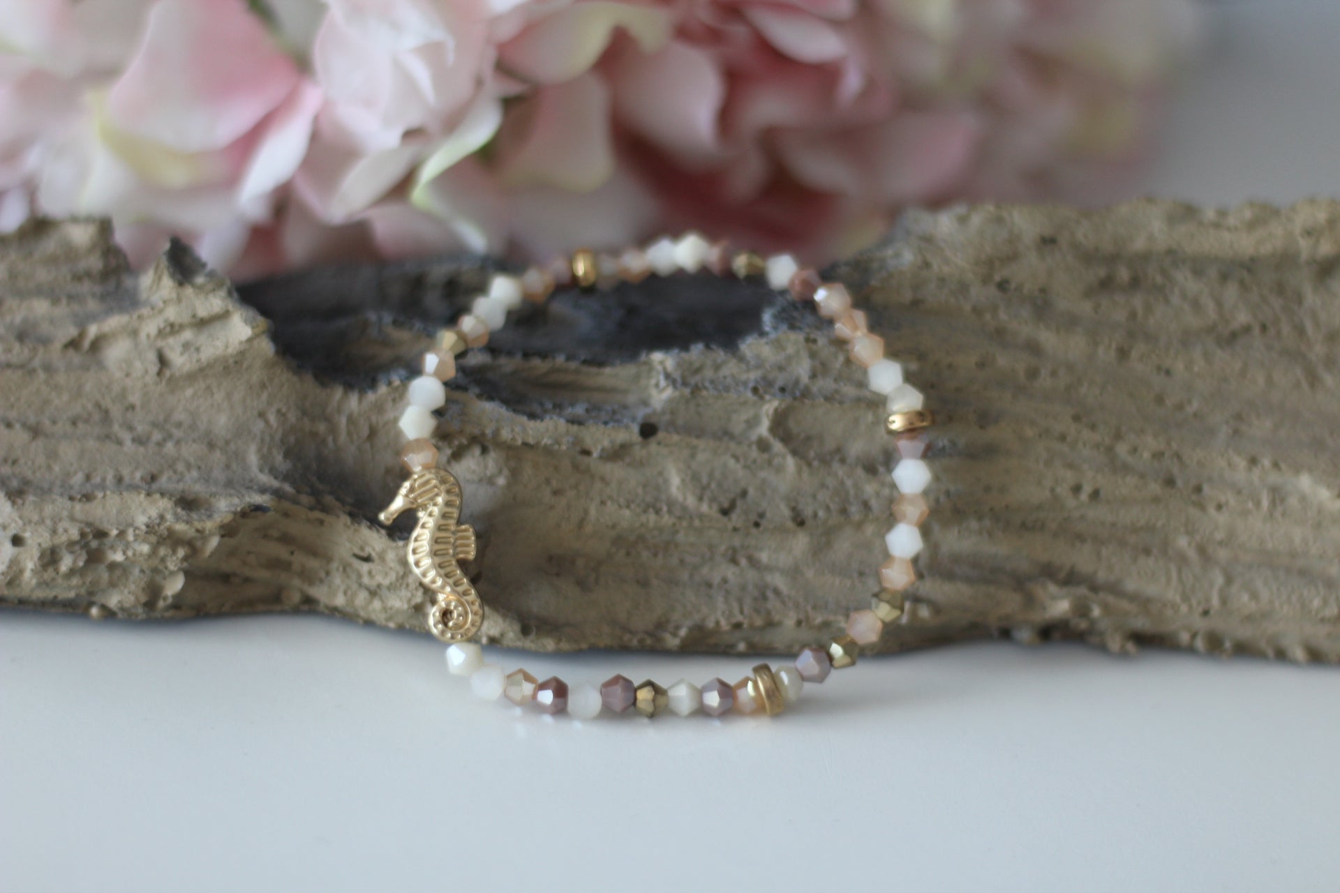 Dieses liebevoll gestaltete Perlenarmband bringt sommerliches Strandgefühl direkt an dein Handgelenk. Zarte Glasperlen in sanften Rosé-, Weiß- und Goldtönen werden von einem goldfarbenen Meeres-Charm geschmückt – wahlweise als Seestern, Schildkröte oder Seepferdchen. Das Armband ist elastisch und passt sich angenehm dem Handgelenk an.