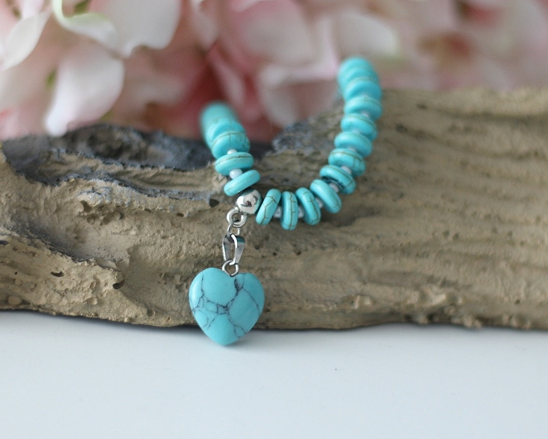 Dieses handgefertigte Armband besteht aus hochwertigen Türkis-Edelsteinperlen, die für ihre intensive, türkisfarbene Ausstrahlung und charakteristische Maserung geschätzt werden. Der Blickfang ist ein passender Herzanhänger aus dem gleichen Stein, der das Design liebevoll abrundet.