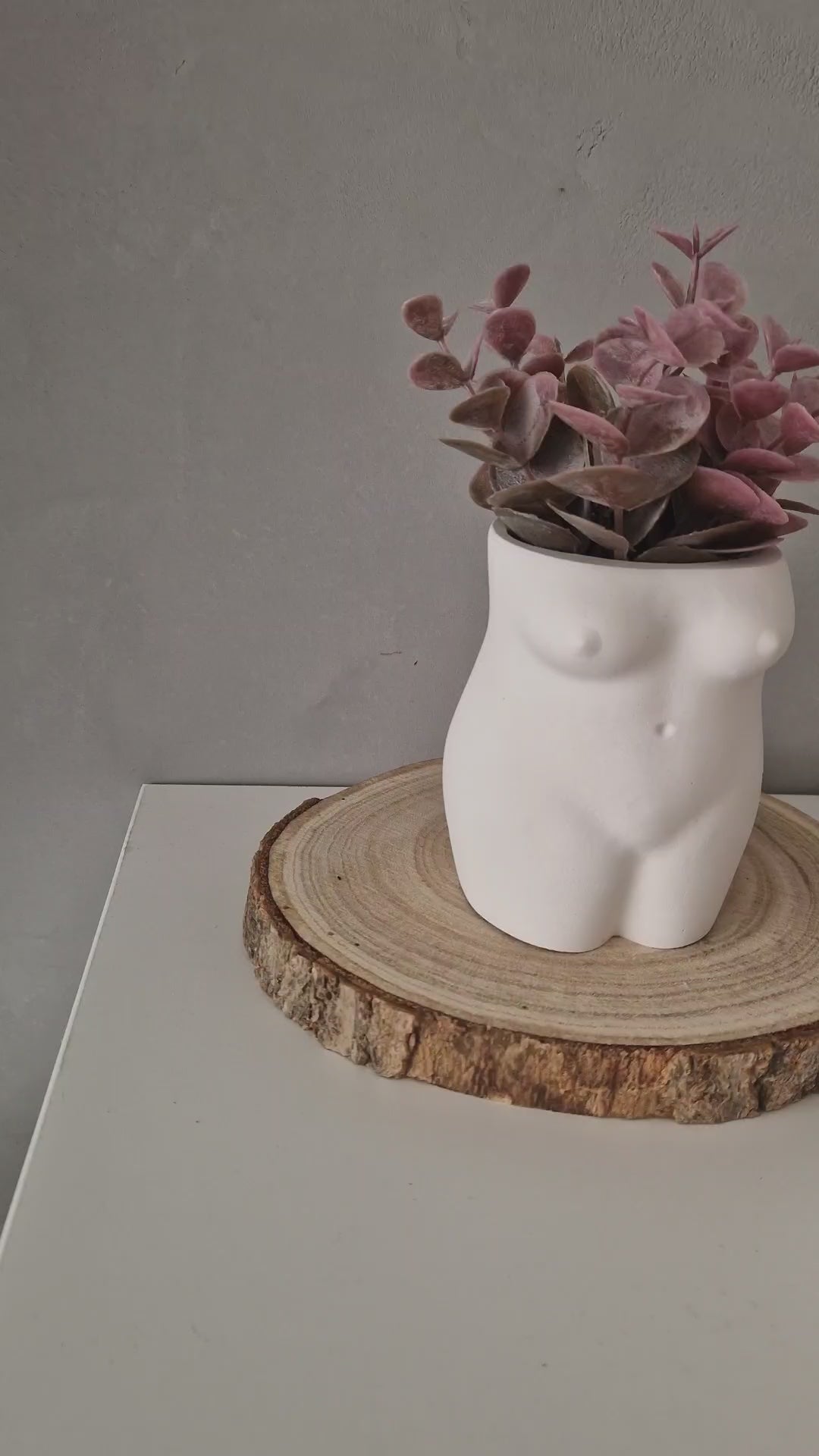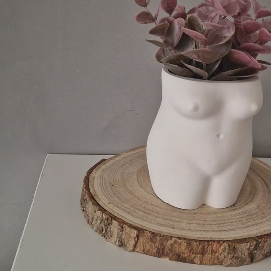 Diese handgefertigte Vase in Form eines weiblichen Torsos ist eine Hommage an natürliche Schönheit und femininen Ausdruck. Die klaren Linien und die matte, samtige Oberfläche verleihen dem Objekt eine skulpturale Ästhetik. Gefertigt aus hochwertigem Raysin eignet sich diese Vase perfekt als minimalistisches Dekoobjekt oder als stilvoller Behälter für Trockenblumen, Zweige oder kleine Accessoires.