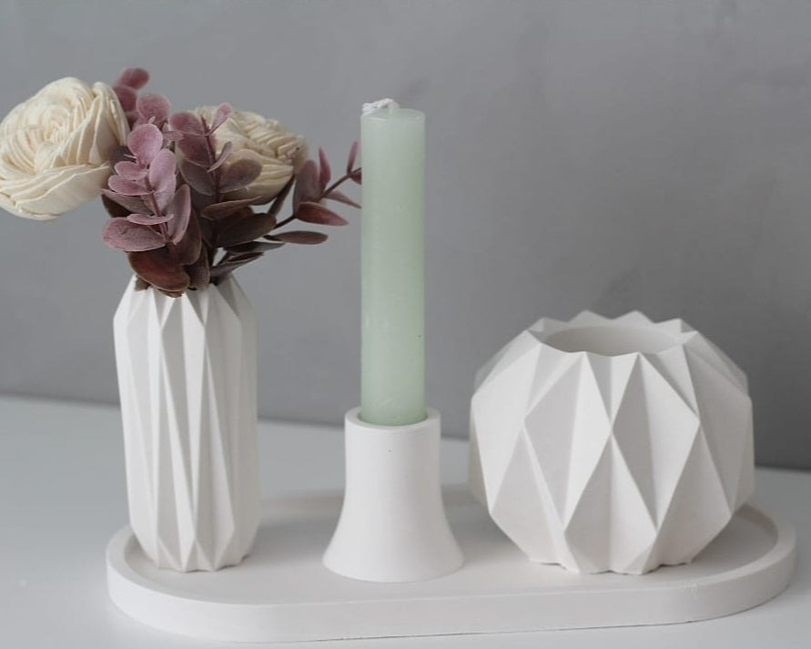 Dieses handgefertigte Deko-Set aus hochwertigem Raysin kombiniert minimalistisches Design mit moderner Geometrie. Bestehend aus zwei facettierten Vasen, einem schlichten Kerzenhalter und einem passenden Tablett, ist es ein stilvolles Highlight für dein Zuhause. Ideal als Tischdeko, Wohnaccessoire oder Geschenkidee.