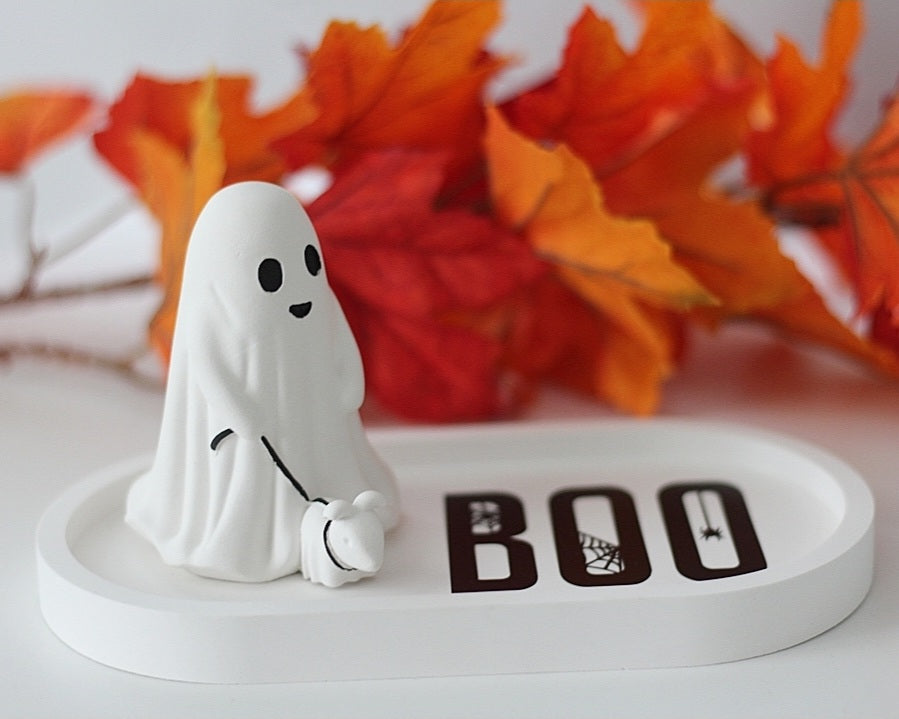 Mit dieser süßen Dekofigur holst du dir einen besonderen Hingucker für deine Halloween-Deko nach Hause. Der kleine Geist hält einen Hund an der Leine und sorgt so für einen originellen und gleichzeitig freundlichen Akzent. Auf dem weißen Tablett mit dem Schriftzug „BOO“ kommt die Figur perfekt zur Geltung und passt ideal auf Tisch, Regal oder Fensterbank.
