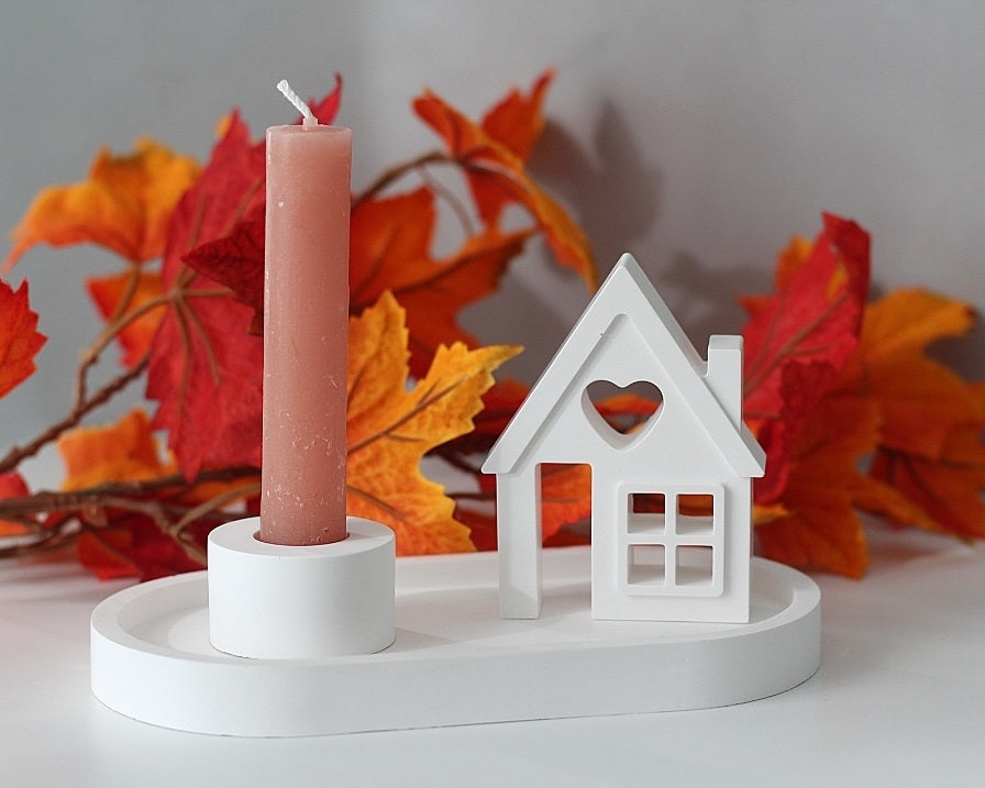 Dieser liebevoll gestaltete Kerzenhalter mit Häuschen aus hochwertigem Raysin bringt Wärme und Gemütlichkeit in jede Einrichtung. Das Set besteht aus einem stilvollen Tablett, einem Häuschen mit Herzfenster und einem passenden Halter für eine Stabkerze – perfekt für die Herbstzeit oder ganzjährig als charmante Dekoration.