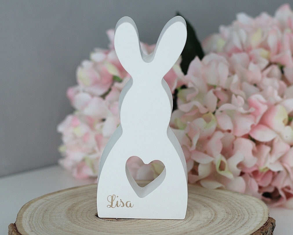Ein liebevoll handgefertigter Osterhase aus Raysin mit ausgestanztem Herz und personalisierten Namen– perfekt als individuelle Tischdeko, kleines Ostergeschenk oder als Highlight im Osternest. Schlicht, modern und zeitlos – ideal für die Frühlingszeit oder als süßes Deko-Element.