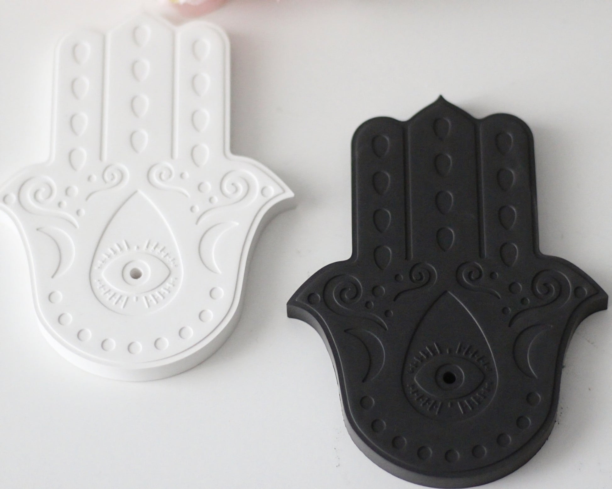 Dieser handgefertigte Räucherstäbchenhalter in Form der Hand der Fatima ist nicht nur ein funktionales Accessoire, sondern auch ein kraftvolles Symbol für Schutz, Segen und spirituelle Harmonie. Gefertigt aus hochwertigem Raysin, ist er in mattem Weiß oder Anthrazit erhältlich und eignet sich ideal für Meditationsräume, Rituale oder als dekoratives Wohnaccessoire.