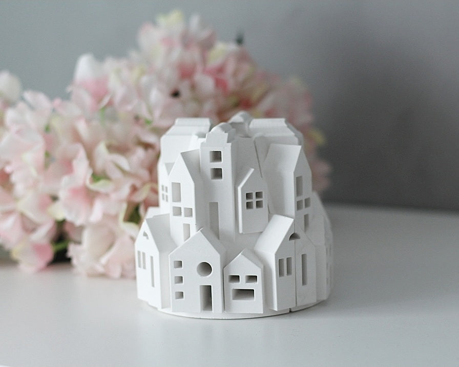 Dieses kunstvoll gestaltete Lichthaus-Dorf ist ein stilvoller Blickfang für die Winter- und Weihnachtszeit oder als ganzjähriges Dekoelement für Liebhaber nordischer Klarheit. Die kleinen Häuser mit filigranen Fenstern und Türen sind aus hochwertigem Raysin gefertigt und bilden ein geschlossenes Ensemble in Rundform. In der Mitte ist Platz für ein LED-Teelicht, das das gesamte Dorf von innen heraus sanft zum Leuchten bringt.