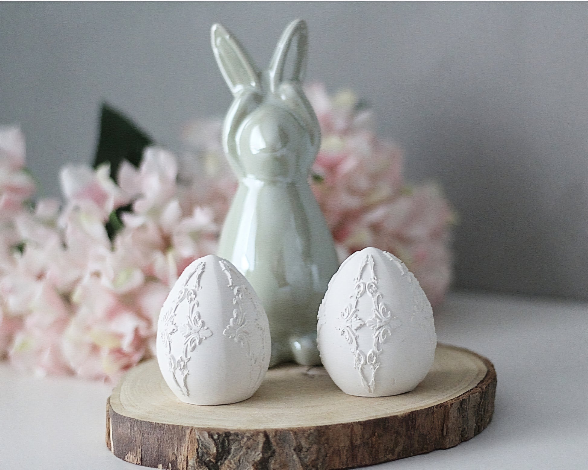 Verleihe deiner Frühlings- oder Osterdekoration einen Hauch von Eleganz mit diesen handgefertigten Deko-Eiern aus hochwertigem Raysin. Die filigranen Ornamente im Vintage-Stil machen jedes Stück zu einem kleinen Kunstwerk und bringen eine stilvolle, natürliche Note in jedes Zuhause.