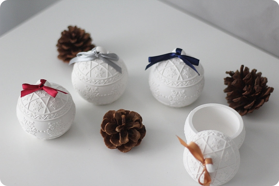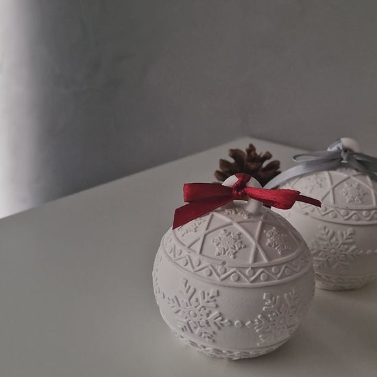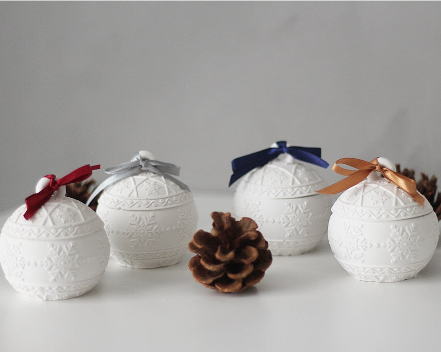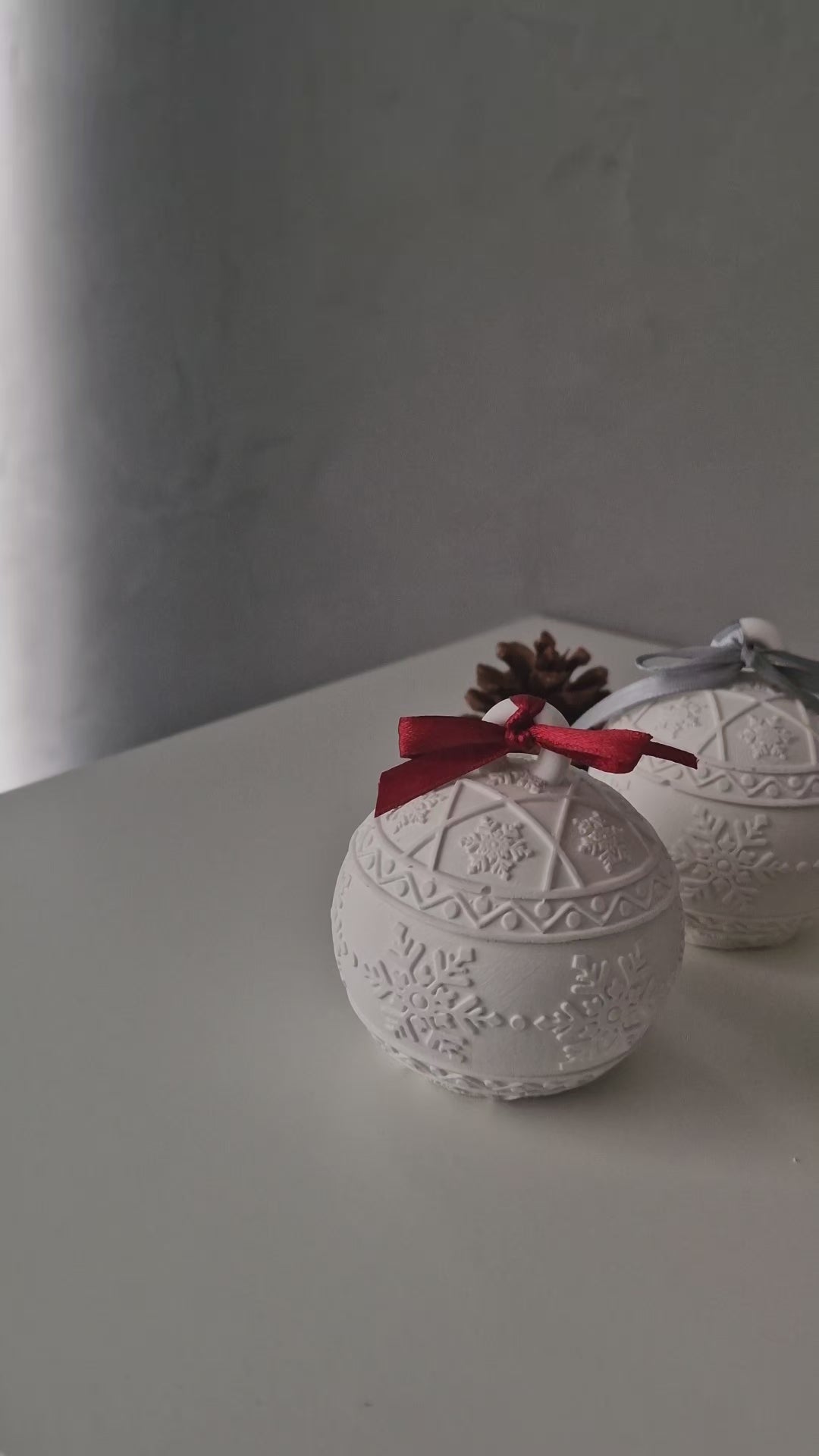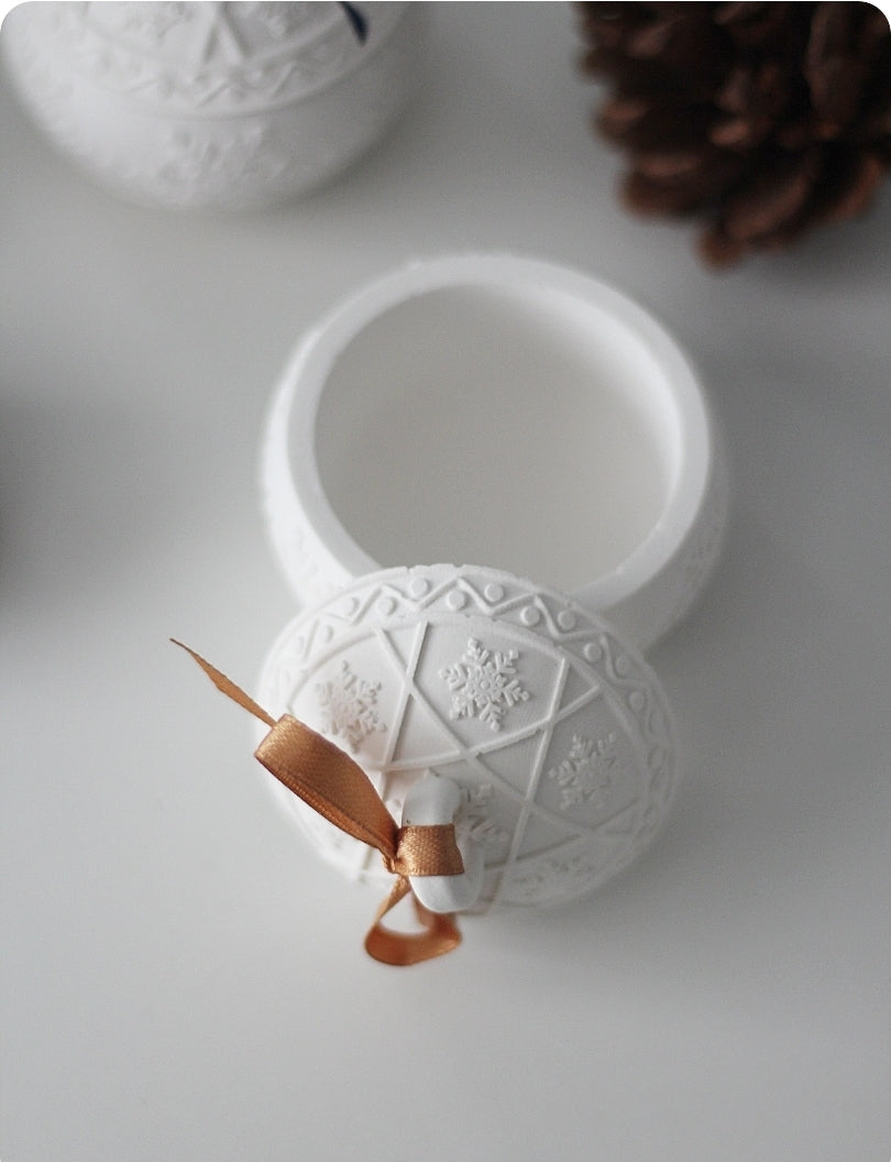 Das Design erinnert an eine edle Weihnachtskugel mit feinen Schneeflocken-Reliefs und wird von einer hübschen Schleife in verschiedenen Farben verziert.