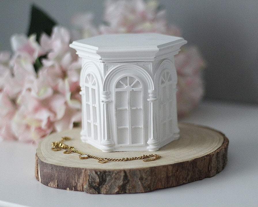Diese handgefertigte Schmuckdose in Form eines stilisierten Fensterhauses ist nicht nur eine praktische Aufbewahrungslösung, sondern auch ein dekoratives Highlight für jedes Zuhause. Die detaillierte Architektur und die sanfte weiße Oberfläche machen sie zu einem einzigartigen Accessoire für Schmuck, kleine Accessoires oder Andenken.