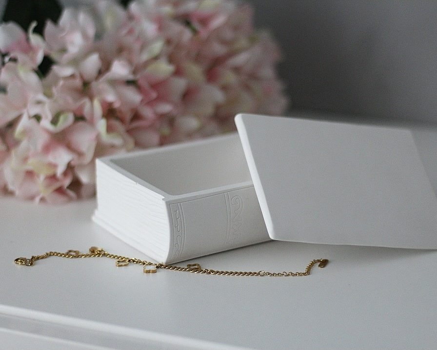 Diese handgefertigte Schmuckbox im Buchdesign ist nicht nur eine praktische Aufbewahrungslösung, sondern auch ein stilvolles Accessoire. Mit ihrer matten weißen Oberfläche und den feinen Details eines Buchrückens eignet sich diese Box hervorragend zur Aufbewahrung von Schmuck, Ringen und kleinen Schätzen.