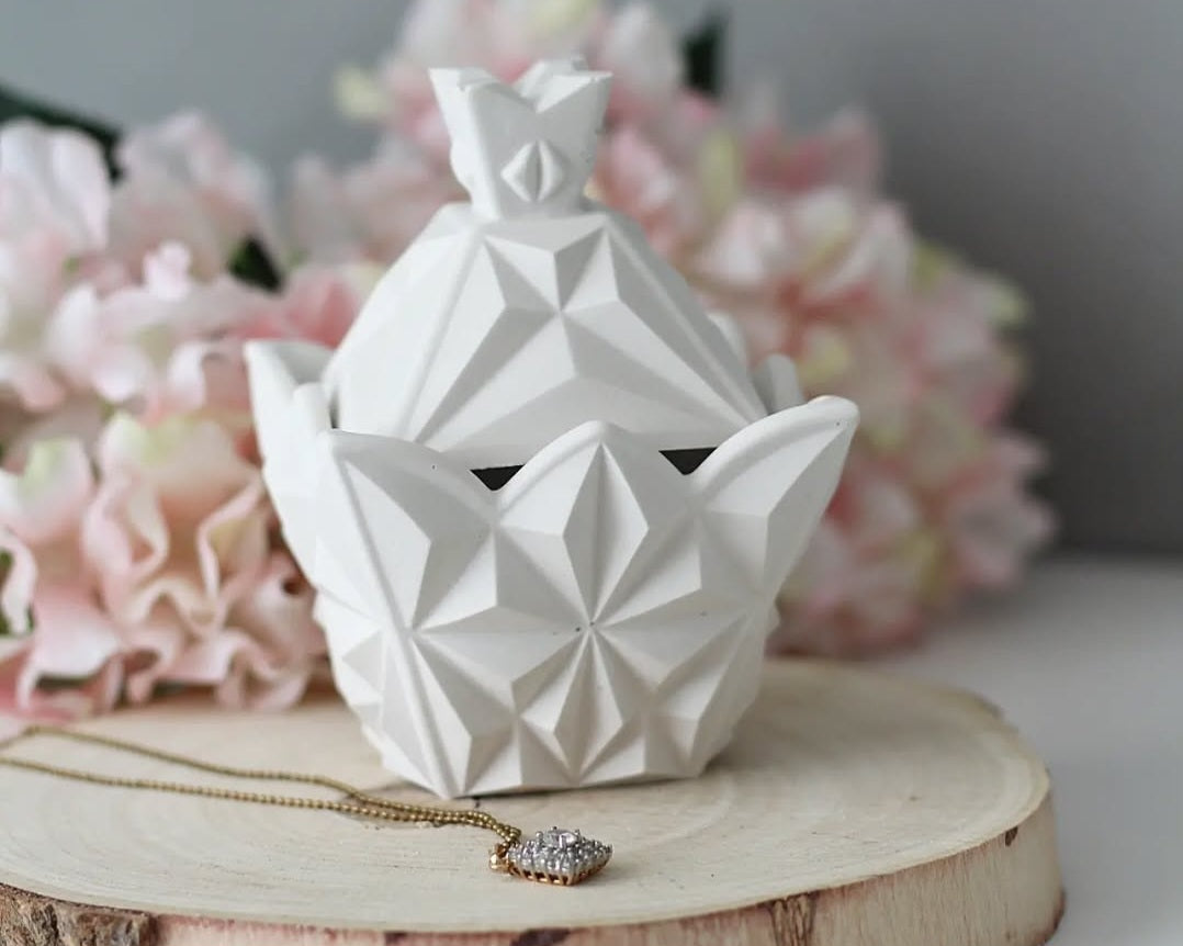 Diese handgefertigte Dose aus hochwertigem Raysin besticht durch ihr markantes, facettiertes Design in kristallähnlicher Optik. Der dazu passende Deckel mit stilisiertem Griff rundet das moderne Erscheinungsbild perfekt ab. Ideal als Schmuckdose, Dekobehälter oder besonderes Highlight auf Tisch, Regal oder Schminktisch.