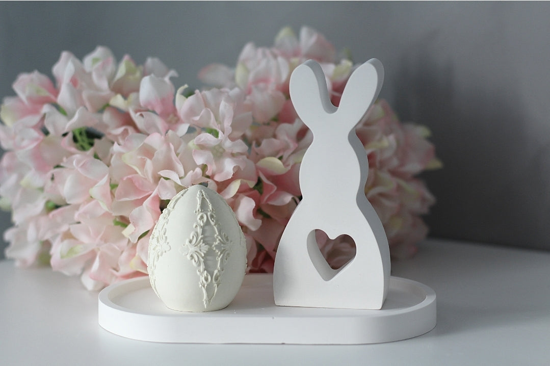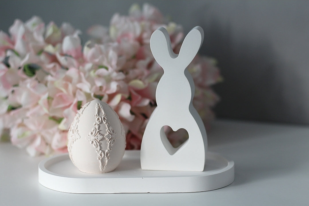Das Ensemble besteht aus einem weißem Hasen mit Herz-Ausschnitt und einem kunstvoll verzierten Dekoei in verschiedenen Farben wählbar, beide auf einem schlichten, weißen Tablett arrangiert. Die filigranen Details des Eies und die sanfte Farbgebung harmonieren perfekt mit dem minimalistischen Hasen – ideal für alle, die zeitlose und stilvolle Dekoration lieben.