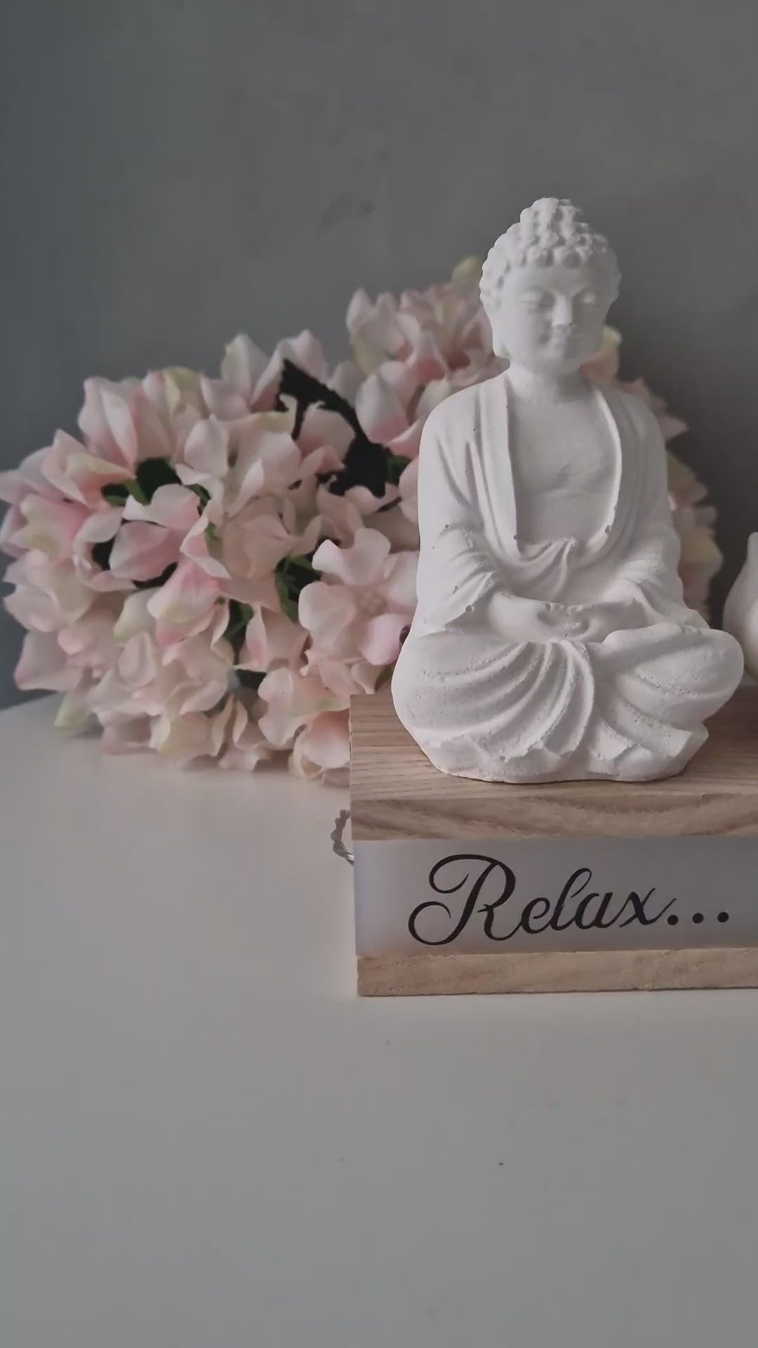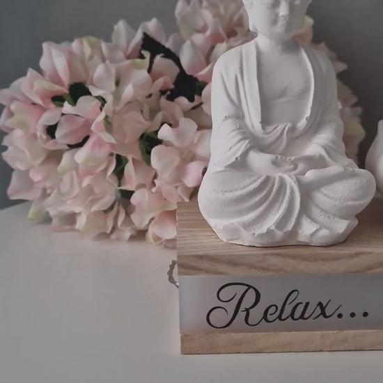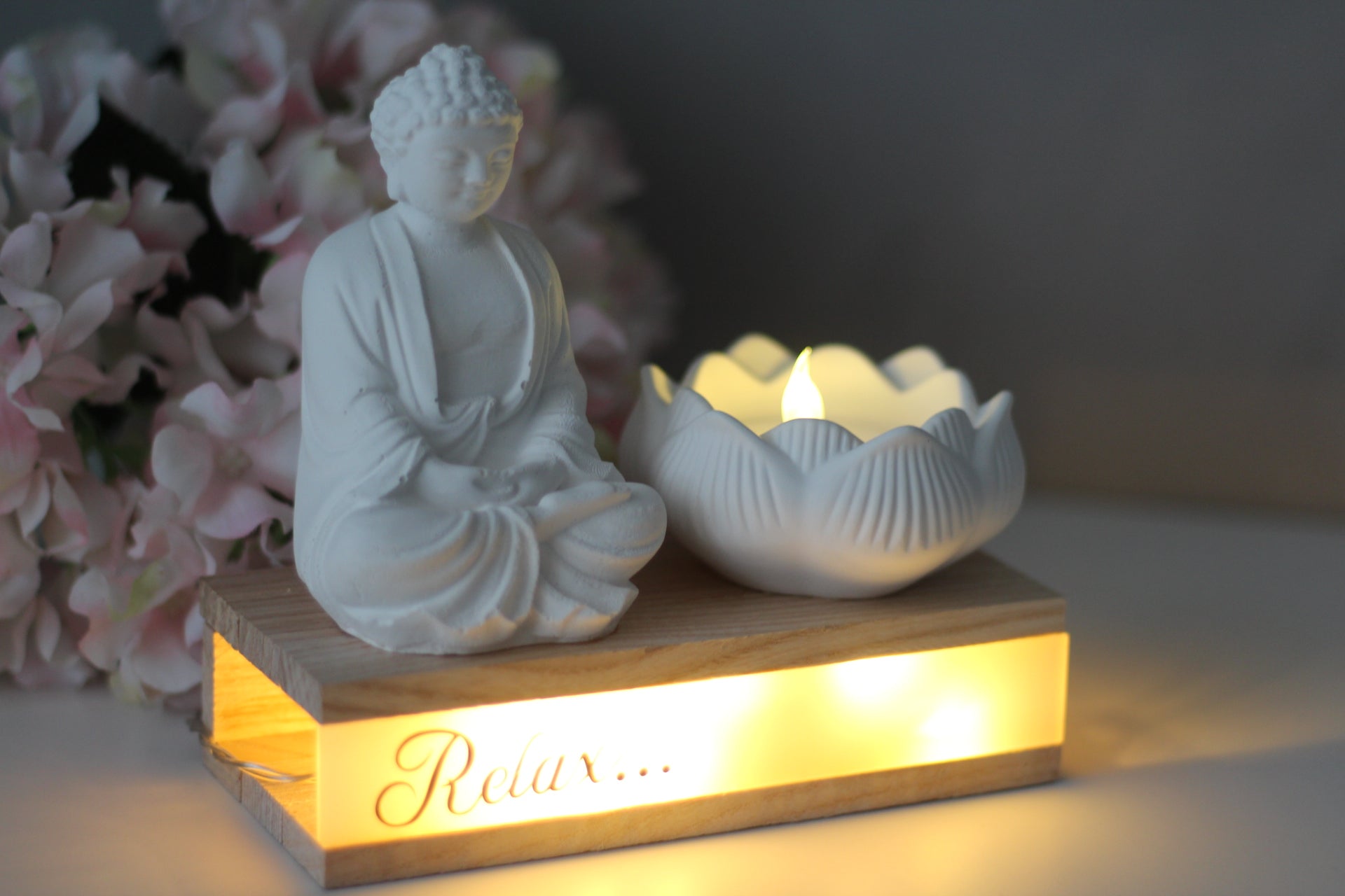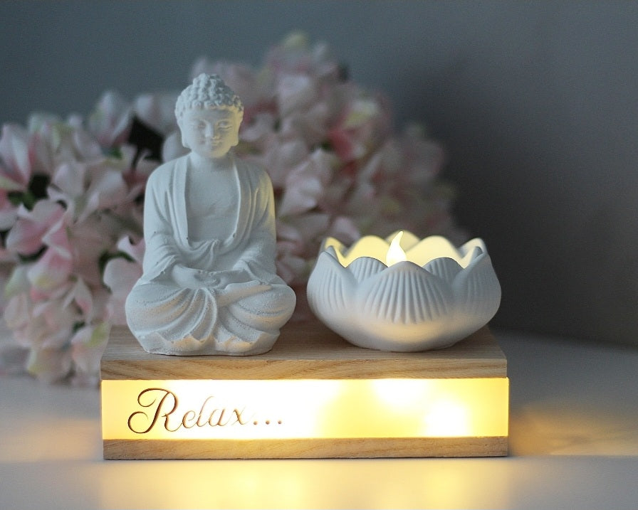 Design: Buddhafigur & Lotus-Teelichthalter auf Holzblock mit LED-Schriftzug „Relax…“