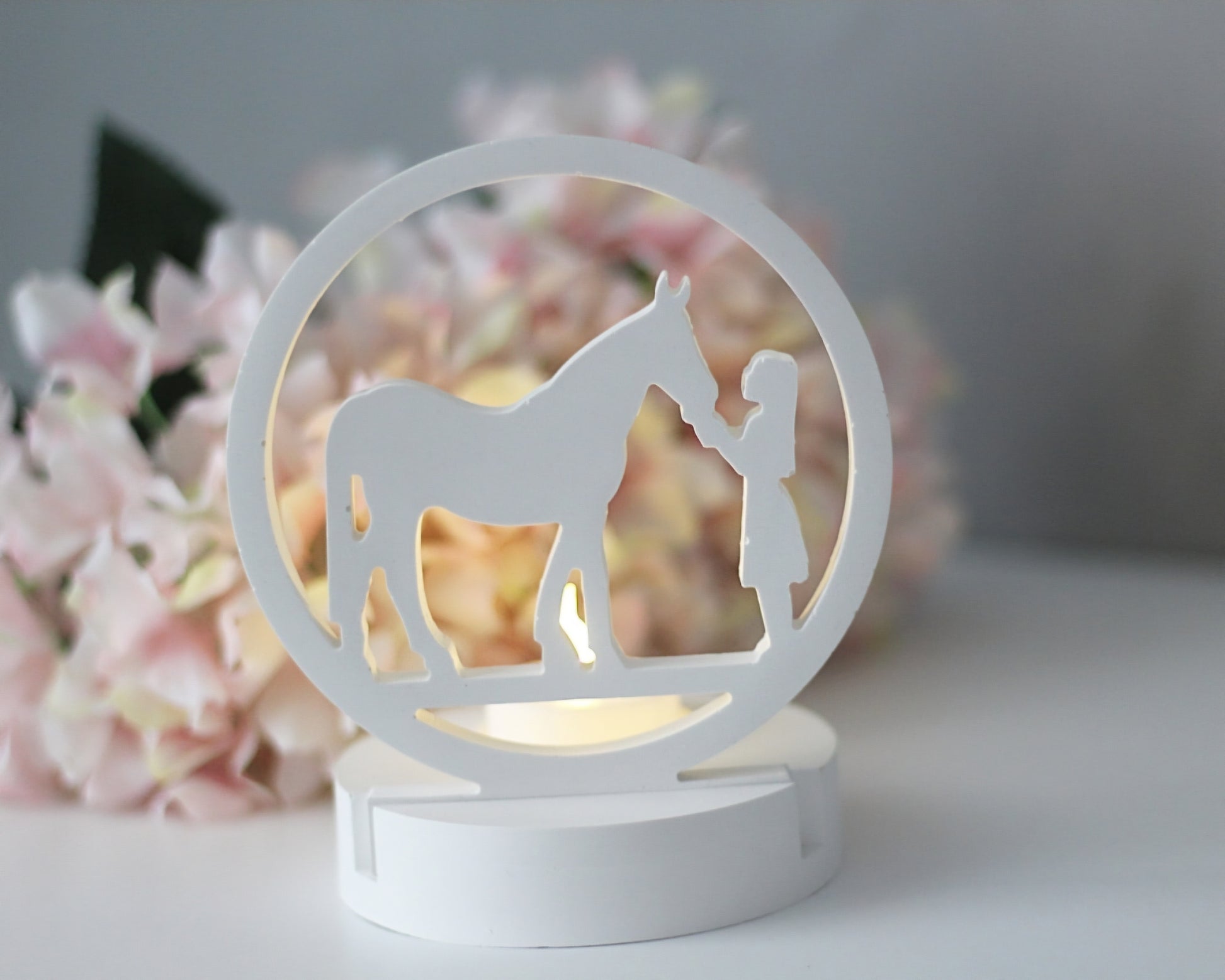 Ein bezauberndes Deko-Highlight für alle Pferdefreunde! Dieser handgefertigte Teelichthalter aus hochwertigem Raysin zeigt eine liebevoll gestaltete Silhouette eines Pferdes mit einem Mädchen in einem runden Rahmen. Das schlichte Design in Mattweiß bringt Ruhe und Wärme in dein Zuhause – perfekt für Regale, Fensterbänke oder als besonderes Geschenk.