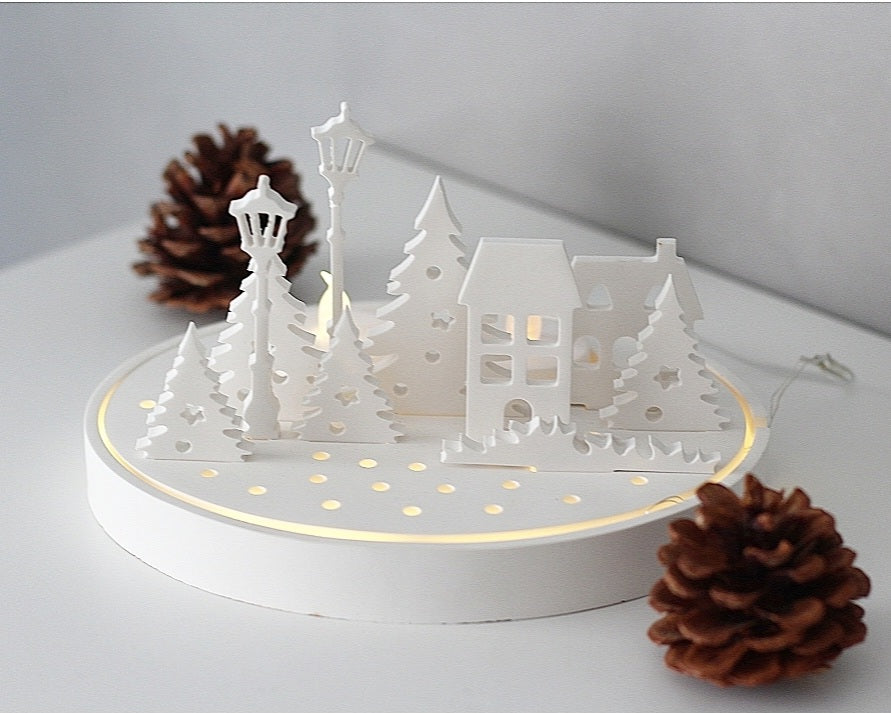 Dieses detailverliebte Winterdorf auf einem runden beleuchteten Sockel vereint stimmungsvolle Beleuchtung mit filigraner Handarbeit. Die Kombination aus kleinen Häuschen, Tannen, Straßenlaternen und einem stilisierten Schneefeld schafft eine zauberhafte Winterlandschaft, die durch eine integrierte Lichterkette sanft beleuchtet wird. Zusätzlich lassen sich Teelichter hinter den Häusern platzieren, was für eine warme, gemütliche Atmosphäre sorgt.