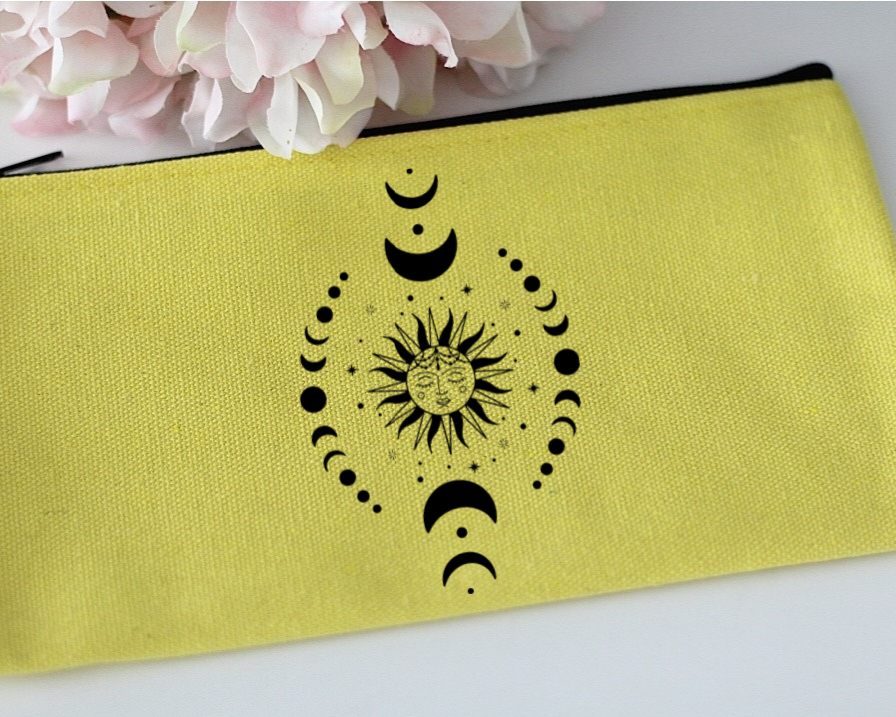 Dieses Etui vereint Ästhetik und Funktion in einem. Das kunstvolle Design mit Sonne, Mondphasen und kleinen Sternen bringt einen Hauch von Magie und Mystik in deinen Alltag. Ideal zur Aufbewahrung von Kosmetik, Schreibutensilien, Schmuck oder Reiseaccessoires – dein stilvoller Begleiter für unterwegs.