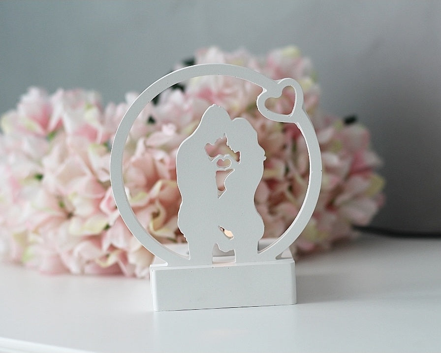 Diese liebevoll gestaltete Lichtfigur zeigt ein zärtliches, werdendes Elternpaar in inniger Umarmung, eingefasst in einen schlichten Kreis mit Herzsymbol. Die Szene strahlt Geborgenheit, Vorfreude und Liebe aus – ein einzigartiges Symbol für die besondere Zeit der Schwangerschaft. Das warme LED-Licht bringt das filigrane Motiv stilvoll zur Geltung und schafft eine harmonische Atmosphäre.