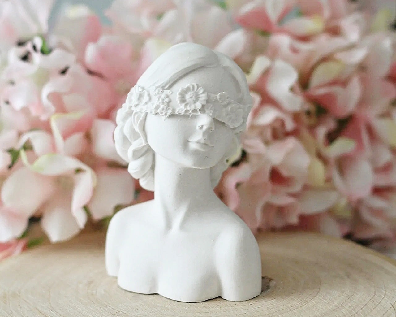 Das florale Band über den Augen verleiht der Figur einen Hauch von Geheimnis und Poesie. Ob auf einem Regal, deiner Kommode oder im Flur – diese Skulptur setzt stilvolle Akzente in modernen, romantischen oder minimalistischen Interieurs.